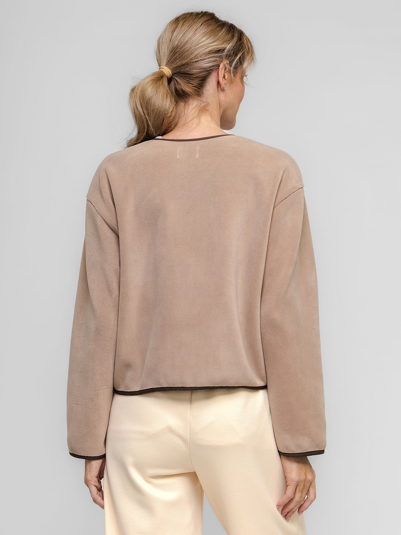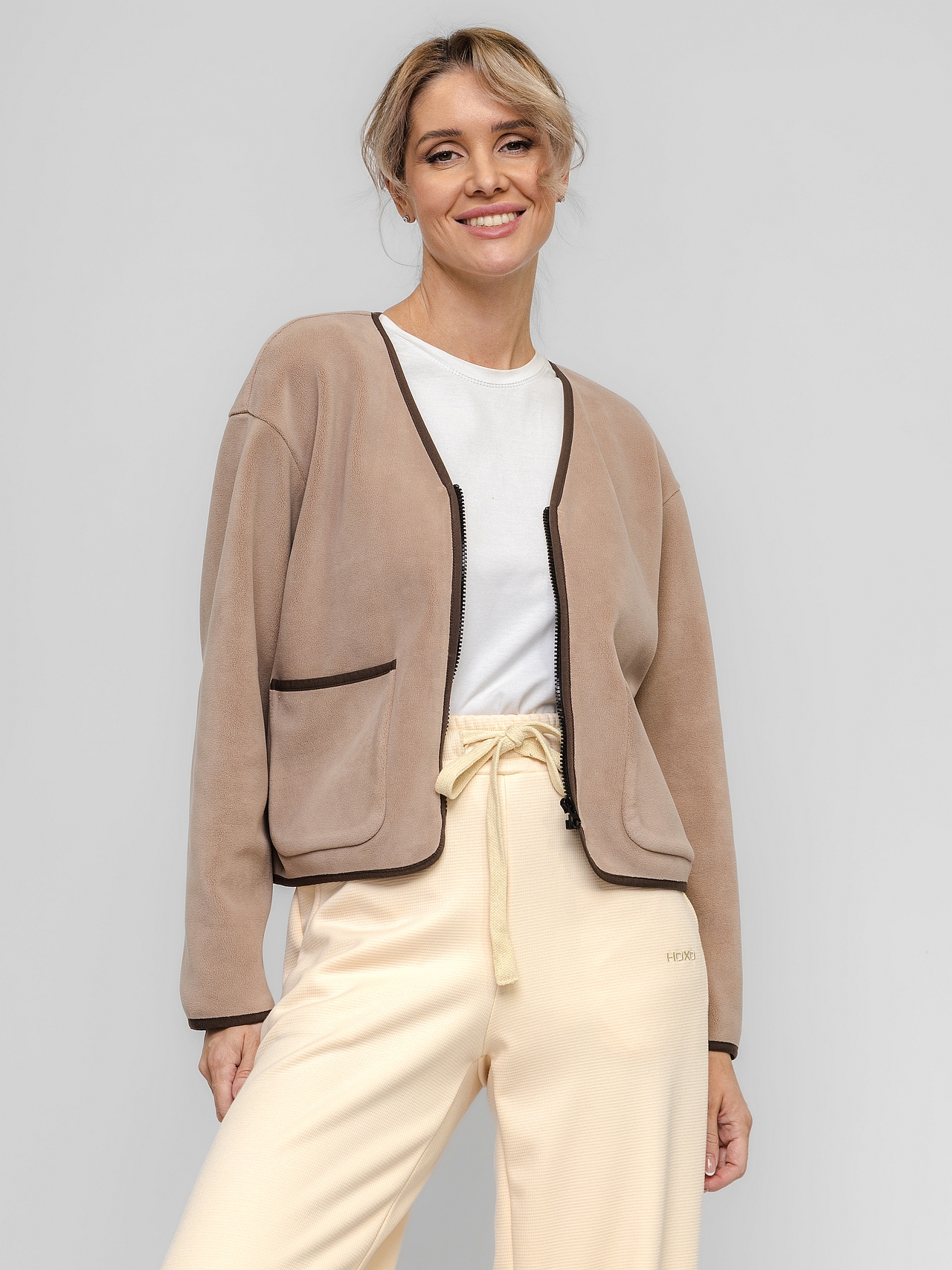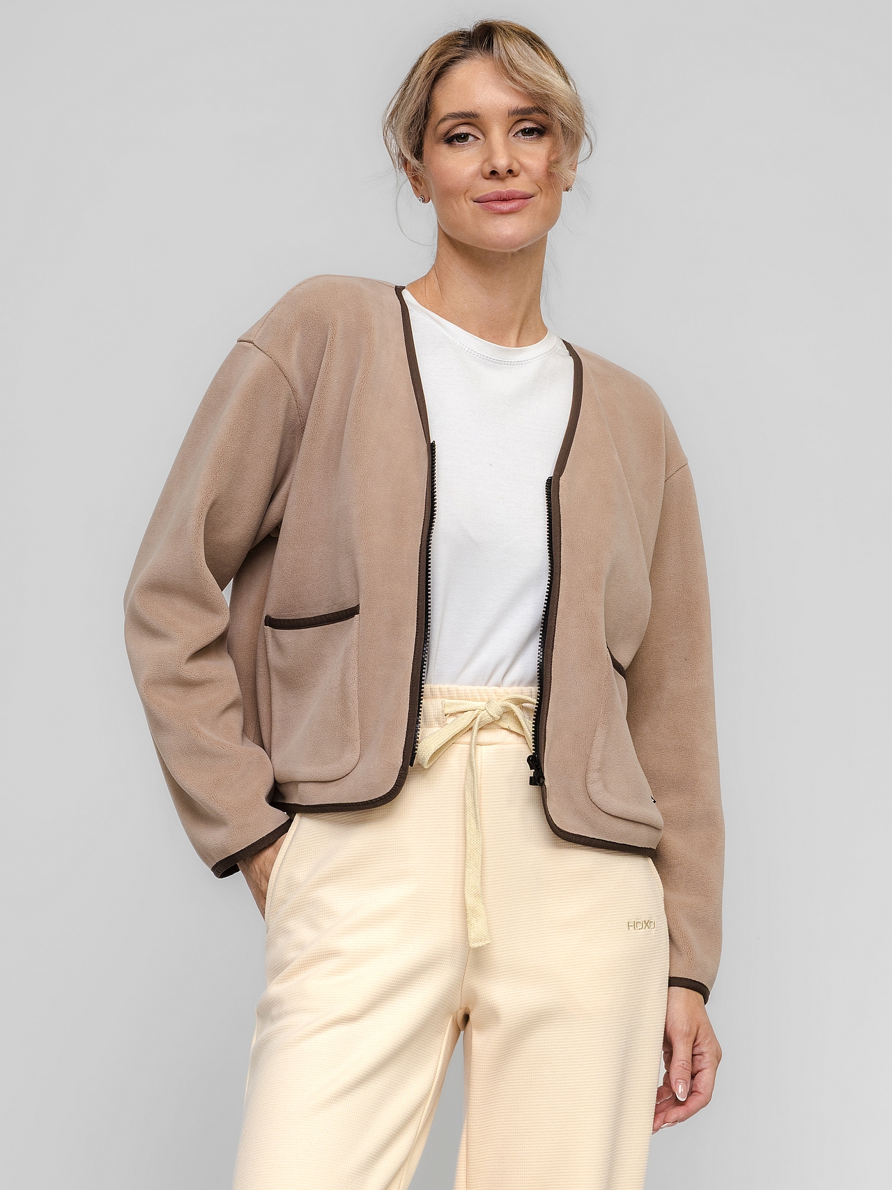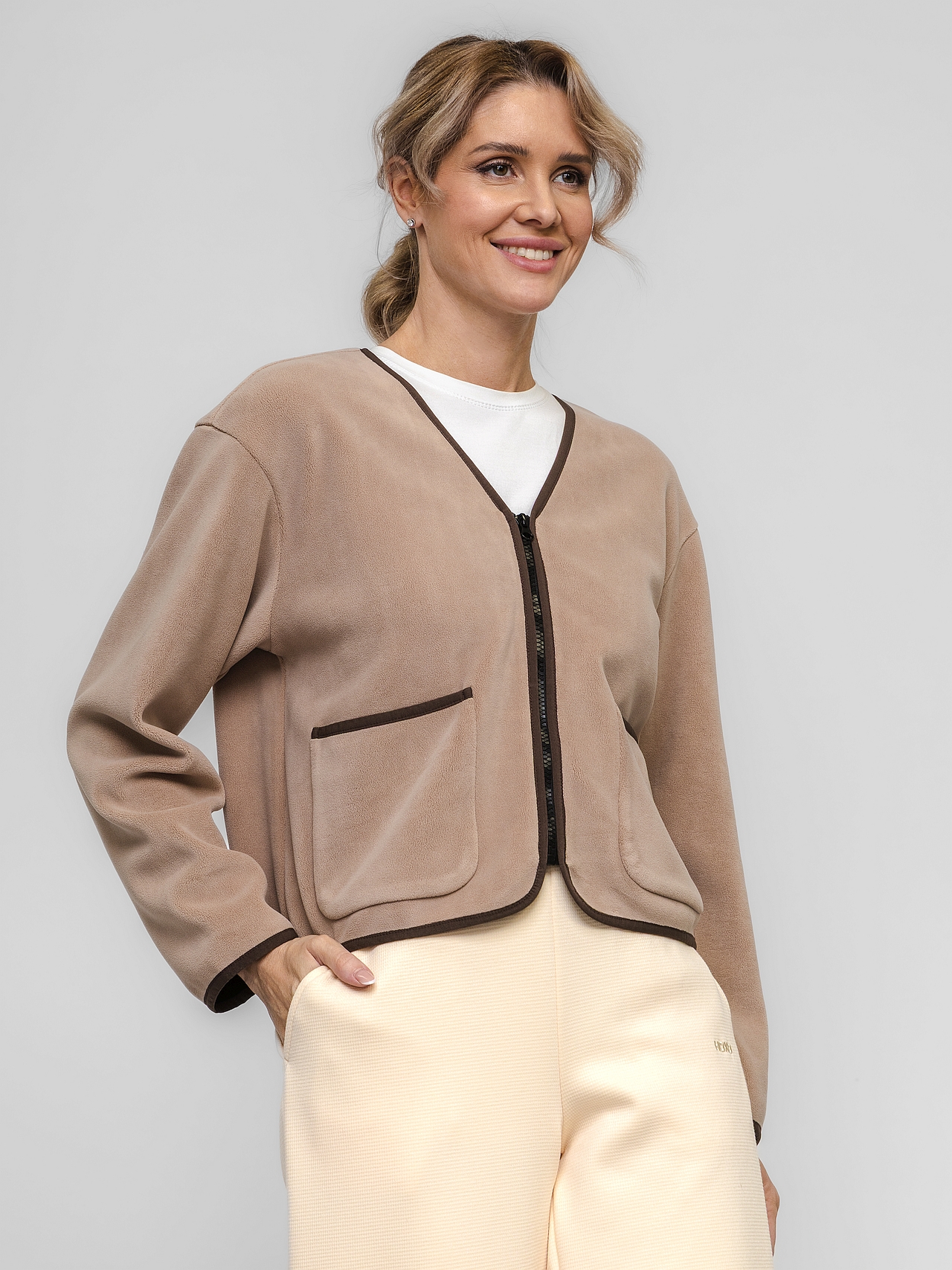 Свободный крой, легкая, невероятно мягкая — куртка для тех, кто ценит комфорт без ограничений. Прямой силуэт и спущенный рукав создают расслабленную посадку, которая не сковывает движения. V-образная горловина и застежка-молния добавляют современный лаконичный штрих. Два накладных кармана спереди — удобно и функционально.