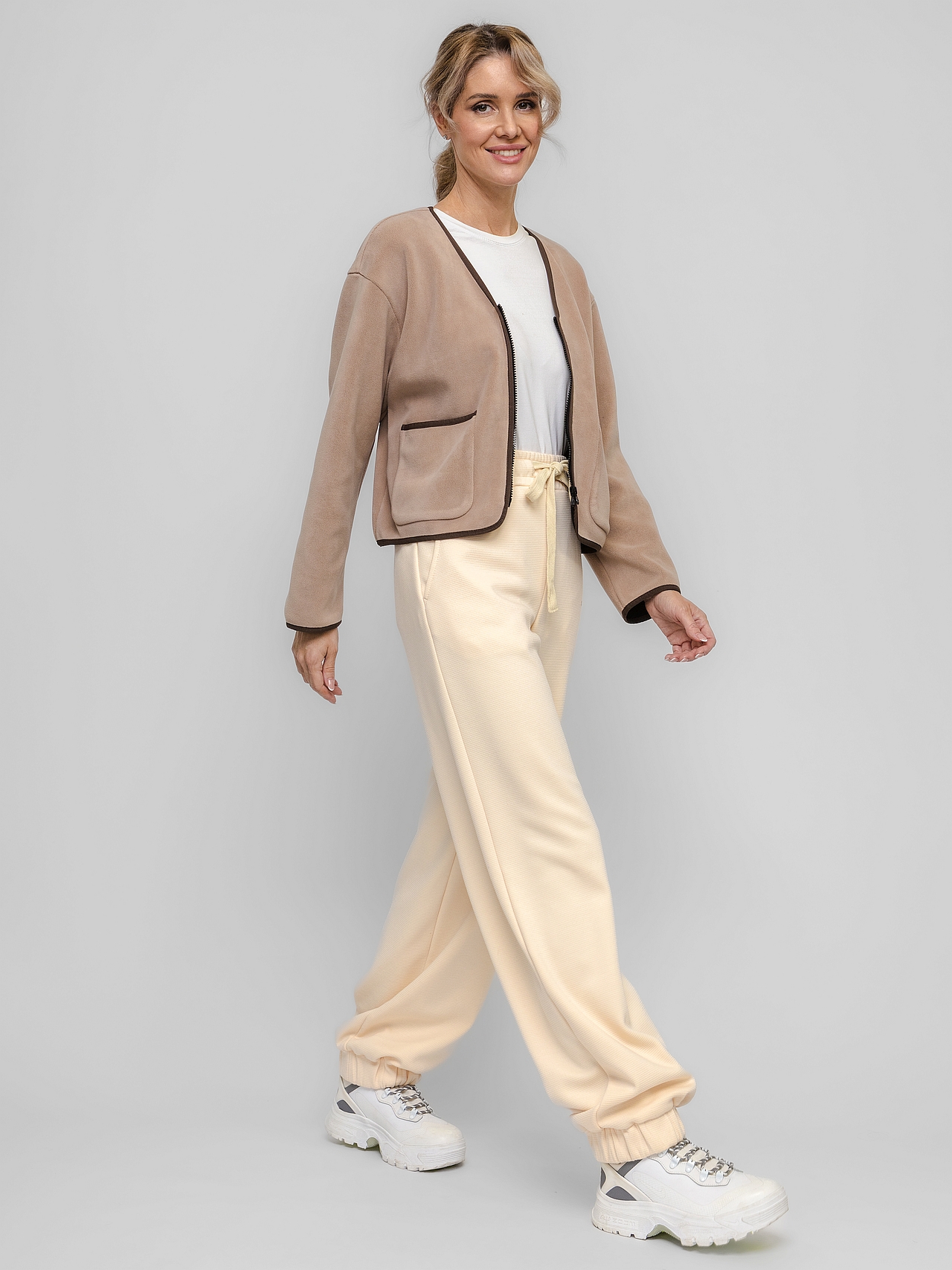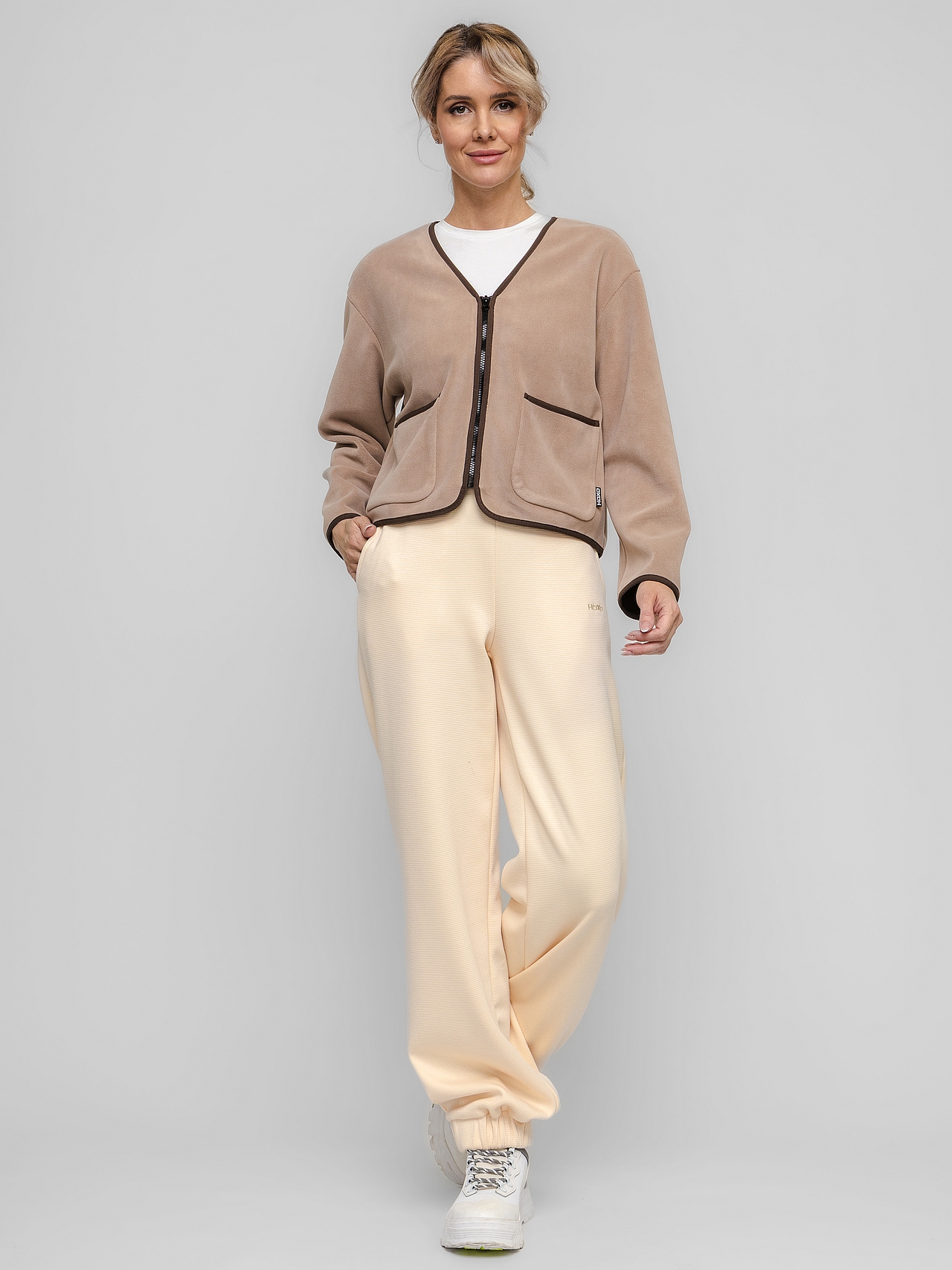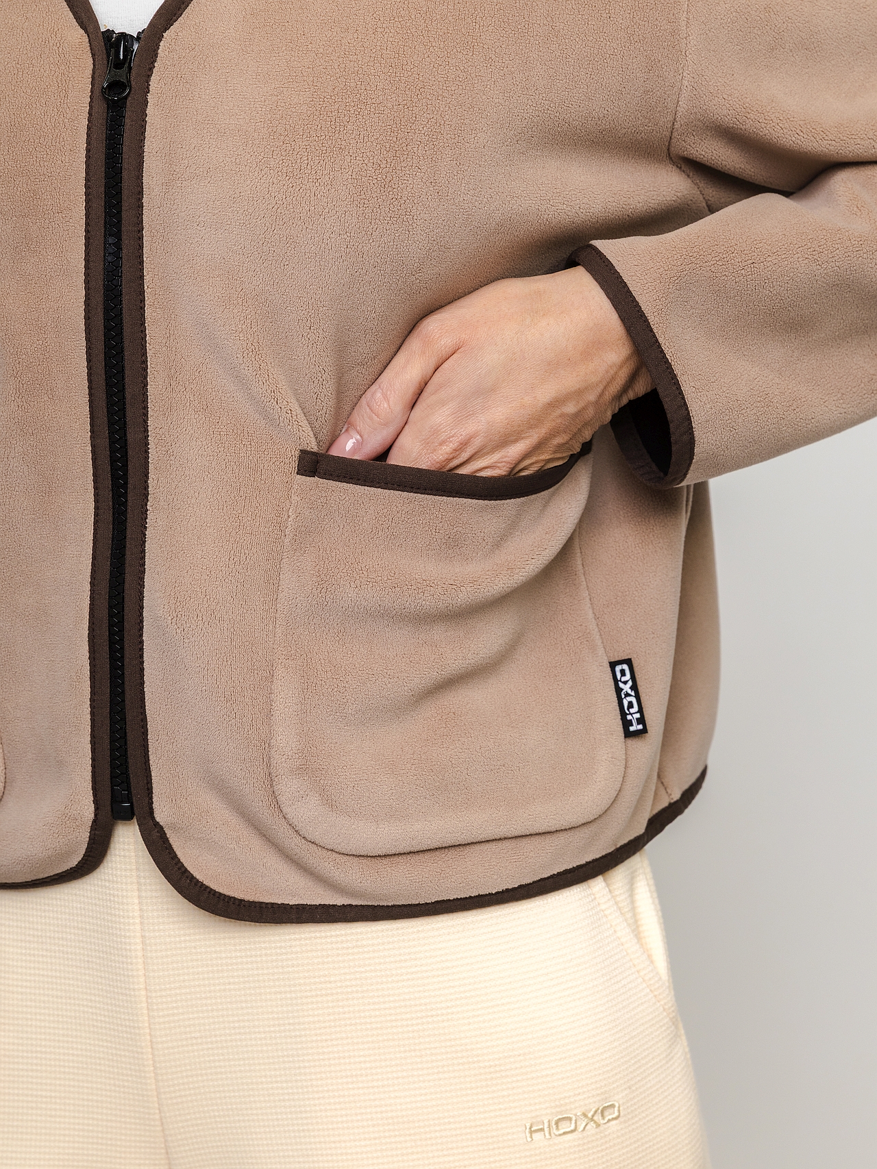 Цвет «Полярный латте» — мягкий кофейный оттенок, вдохновленный северными рассветами и уютом дорожной кружки. Внутренняя сторона — черный трикотаж, добавляющий глубины и практичности.